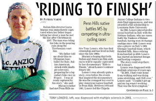 Seeing as how my newspaper's regular website archives are currently unavailable because of the transition to a new format, I wanted to post the article, "Riding to Finish," here. I was honored with a Press Club of Western Pa. Golden Quill Award for the story, about a local man living in Italy who battles his multiple sclerosis by competing in insanely-long ultramarathon bike races: